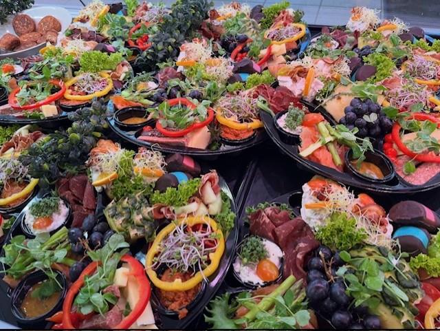 Serveres pænt anrettet på fade, klar til at sætte direkte på bordet.